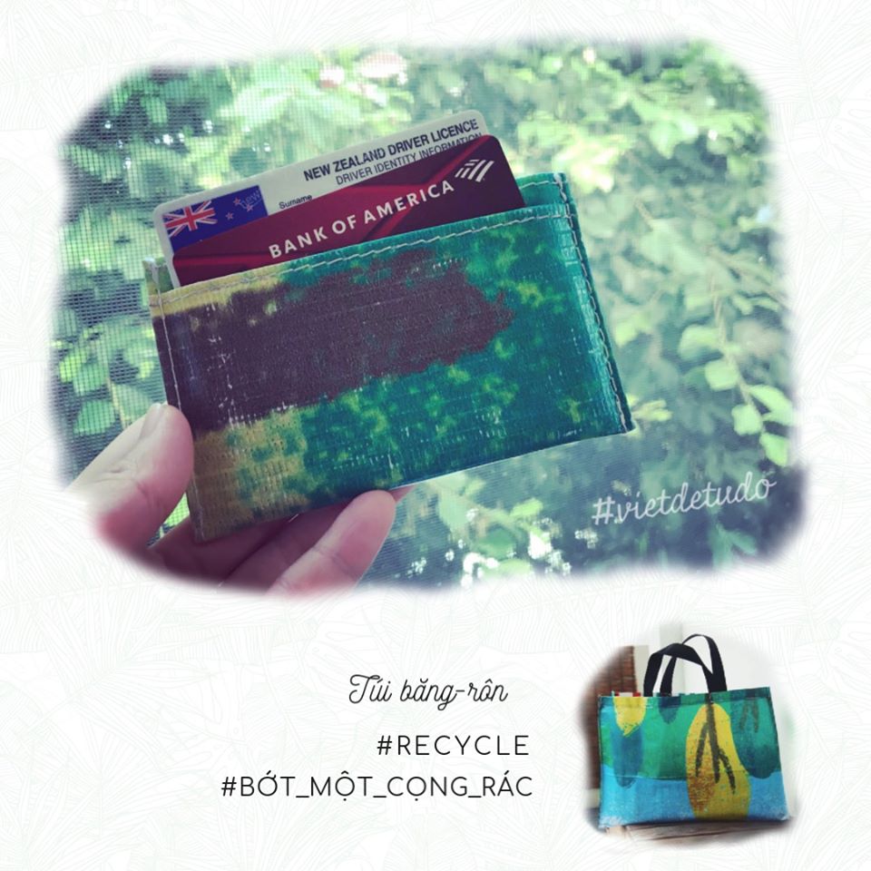 Thiệt ra thì hồi xưa nhờ ông Tiến ròm và mấy cô ở Long An may dùm túi bự đi chợ từ băng rôn. Dè đâu ngày giao hàng, ổng lỏn lẻn cài vô thêm cho mình cái ví nhỏ này làm kỷ niệm. Khúc nhựa to may túi to, mấy phần cắt dư ra thì làm ví nhỏ đựng thẻ, nể dễ sợ. Gần trăm cái túi từ 2 chiếc băng rôn ngày đó đã được bà con ôm về đi chợ hết rồi, lâu lâu chụp hình khoe tui tíu tít rộn ràng. Vui hết sức!