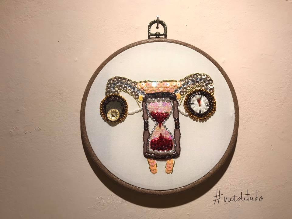 Bạn thêu một cái tử cung (uterus) với những hạt cườm lóng lánh trên khung vải trắng. Chiếc đồng hồ cát trong dạ con lặng lẽ chảy trôi với sự tuần hoàn đều đặn một chu kỳ. Buồng trứng cũng có hình đồng hồ như một sự ám ảnh của thời gian cho trách nhiệm của những người phụ nữ phải gánh vác sứ mệnh tiếp nối bằng những đứa con, thứ được cho là sẽ giảm dần hiệu quả theo năm tuổi.