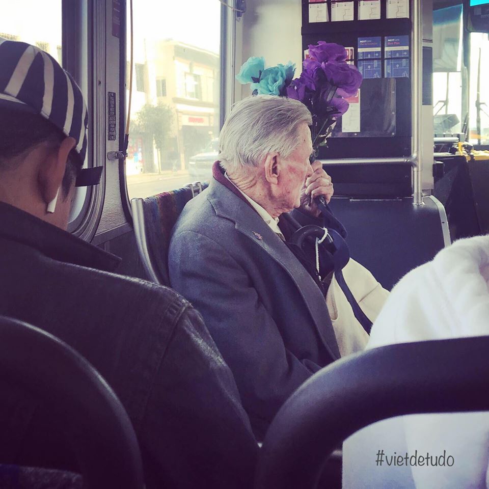 Ở giữa những khoảng nghỉ, tôi thường quan sát chung quanh. Hôm nay tôi thấy ông, và hoa trên tay nâng cao, dịu dàng. Ông cũng là người duy nhất không dùng điện thoại trên xe buýt. Chiếc áo vest cũ nhưng chỉn chu, gắn một chiếc pin cờ hoa trên ve áo như kể một câu chuyện gì. Mái tóc bạc kết thúc ở chân gáy nhăn như những đường vân đá núi in dấu thời gian. Đồi mồi trổ lên da như vỏ cây trong rừng cũ. Bất động. Im lặng. Bàn tay ông nắm chặt đoá hoa nhưng ngồi rất thong thả, rất thảnh thơi.