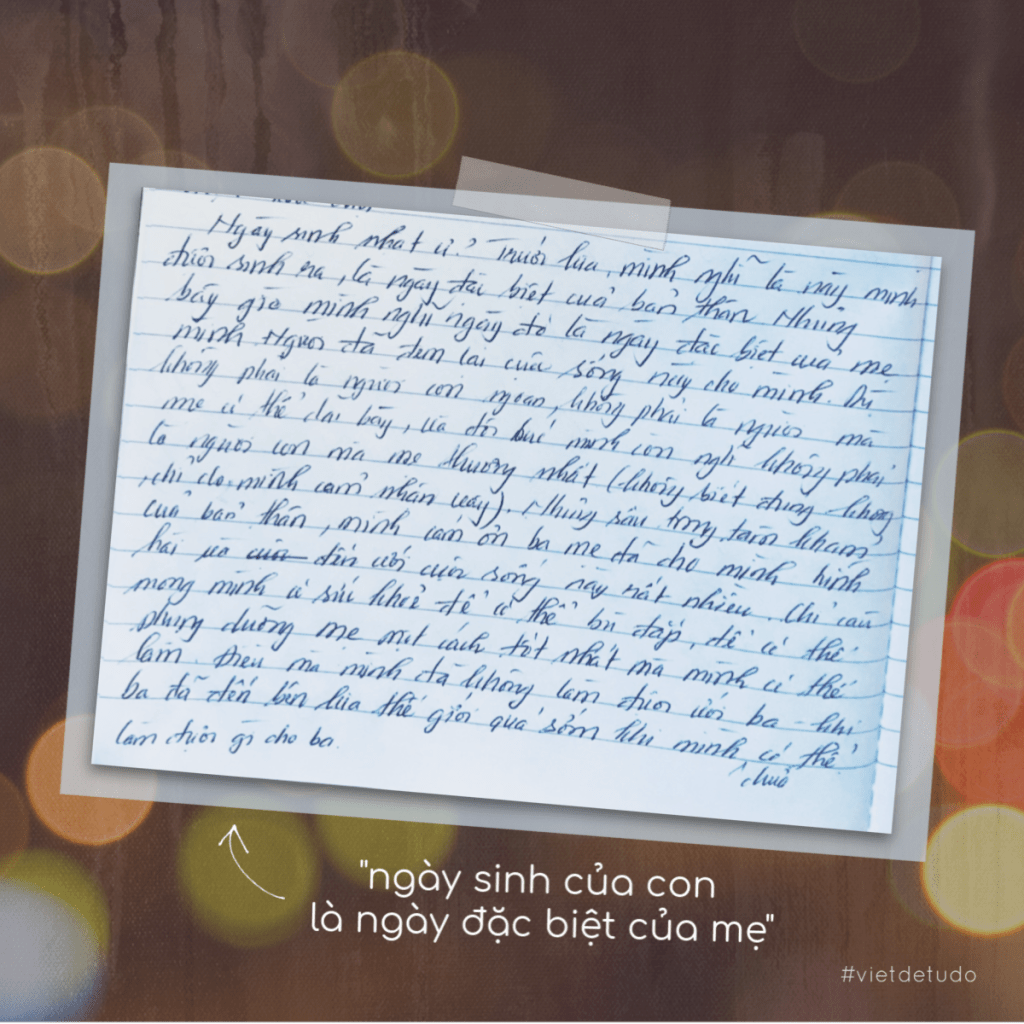 Trong gợi ý viết tuần đầu tiên có câu “Viết về ngày sinh”. Đây là một phần bài của bạn, người từng trách ba má sao ngày sinh của đứa con gái út mà cũng không nhớ, chỉ đơn giản giữ lại tờ lịch bữa đó thôi cũng hong được, để kết cuộc là chọn đại một ngày để khai sinh cho bạn. Bạn chưa bao giờ biết ngày sinh chính xác của mình nên cũng không thấy gì đặc biệt lắm, đến khi bạn có con.