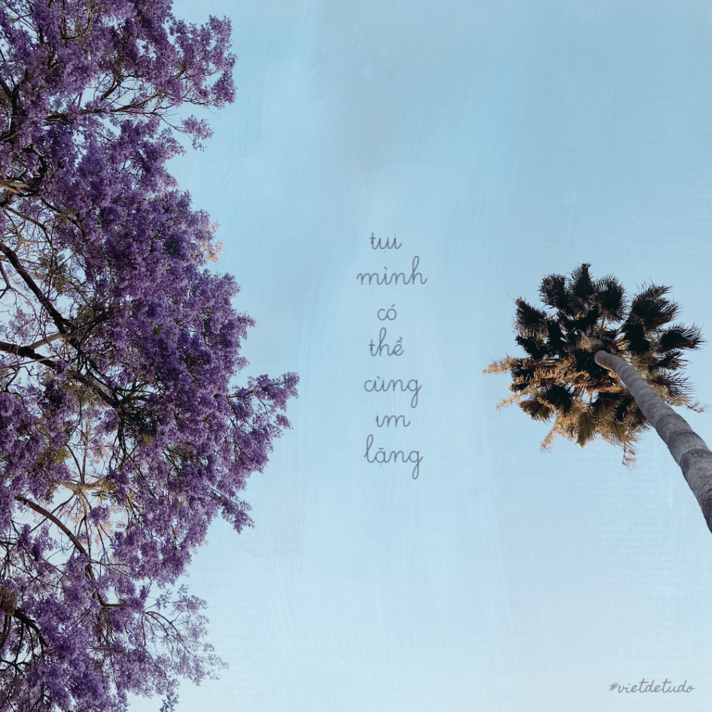 "tụi mình có thể cùng im lặng bởi phong ba đã sẵn ở đây rồi ơ kìa sáng tháng năm tím thẫm vòm trời cao mây vướng ngọn gió, bay. tụi mình có thể cùng im lặng bởi yêu thương đã sẵn ở đây rồi giữa rất nhiều ngọn sóng chiều nay, đó đâu cần nữa lời đau vương trên môi. tụi mình có thể cùng im lặng bởi gặp nhau, khổ, kiếp trước đủ rồi kiếp này lỡ gặp lại nhau lần nữa đâu cần thiết khổ lại chuyện xa xôi. tụi mình có thể cùng im lặng để tan vào im lặng ở trong nhau..."