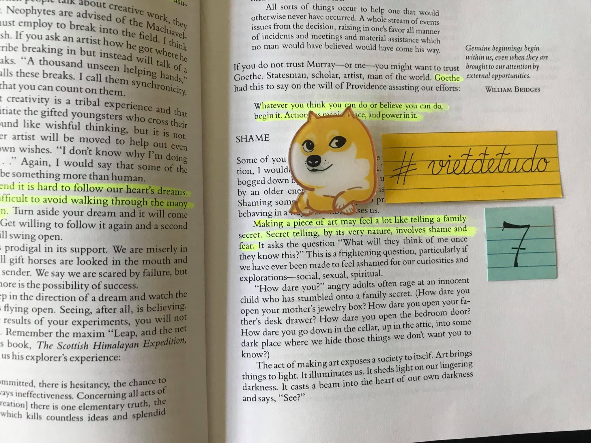 , p.67 – P. 72: Đây là 2 phần mở não nhất trong chương, bởi ai cũng từng trải nghiệm xấu hổ khi sợ người khác xem tác phẩm, đọc bài của mình rồi phán xét mình; bởi making art là phô bày một / nhiều phần thường được giấu kín, chôn chặt. Tác giả có giải pháp để vượt lên sự ngại ngùng này để tiếp tục được sáng tạo, được là mình. Tác giả cũng có giải pháp cho vấn đề làm sao nhận những lời feedback (dù là chỉ trích hay đóng góp cải thiện) mà mình vẫn cảm thấy an toàn, vững mạnh, bạn đọc đi rồi biết hehe… Nên nhớ cô Julia thực tập những điều này sau khi bị từ chối các kịch bản ở Hollywood một cách thô thiển và lịch sự, và cô đã có cách để vượt qua, tiếp tục sáng tác. - “GROWTH”