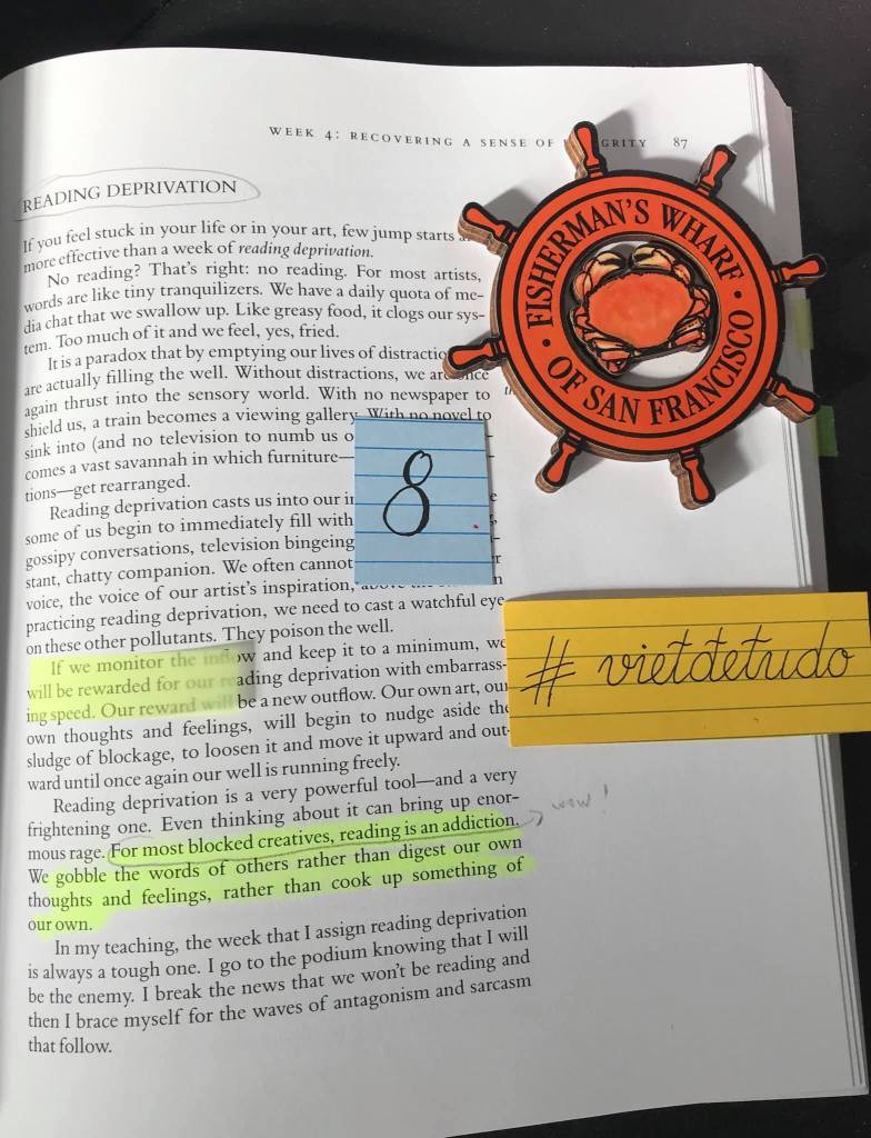 - “READING DEPRIVATION”, p.87: Một ngạc nhiên là với nhiều blocked creatives, họ chọn đọc như bị nghiện, nhưng để lấp mình đi thay vì tiêu hóa vấn đề, suy nghĩ, cảm xúc của mình. Công cụ giúp detox cả suy nghĩ và thái độ, để đi tới việc phóng thích các thứ chất chứa bên trong qua art của mình. Cách làm xin mời tự đọc!