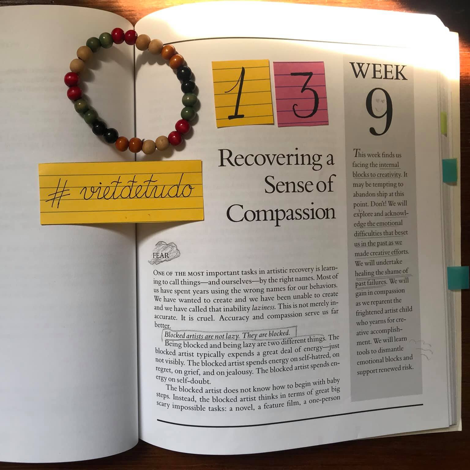 - “ENTHUSIASM”, p.153: Hồi đọc chỗ này mình buồn cười lắm, đổ thừa vì mình là một Nhân Mã nên dù viết mỗi ngày nhưng mình không phải kiểu ngày nào cũng phải dậy 4 giờ đúng boong rồi hì hụi viết hì hụi đọc…, Julia cho rằng kiểu kỷ luật đó có thể hiệu quả đường ngắn vì mình tự ngưỡng mộ “Trời, sao mình giỏi dzị?!” nhưng đường dài thì có thể làm mất đi niềm vui và sự sáng tạo. Viết 3 trang mỗi ngày mà thành “duty” – “nhiệm vụ” thì oải lắm! Đừng kỷ luật kiểu quân đội, hãy giữ cho mình lòng nhiệt thành, nhiệt tâm, hào hứng… của một đứa trẻ để phá đi creative blocks và thực hành hằng ngày, vì “art is process”.