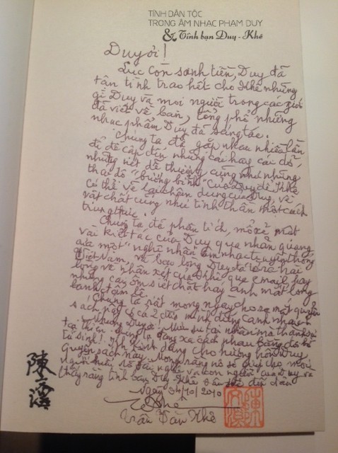 Âm nhạc và ngôn từ luôn là hai cánh tay nâng đỡ mình dịu dàng. Mình nghe Phạm Duy và đi theo lời từ khi như đùa khi nghiêm túc, giản dị và sâu sắc, tắm trong nhạc điệu như võng đưa, lúc lại ngân chạm trời có khi lại lẫn vào trong đất cát. Mình thấy mình thích nghe Phạm Duy lúc cô đơn, lúc muốn “mơ giấc mộng dài, đừng lay tôi nhé cuộc đời xung quanh…”