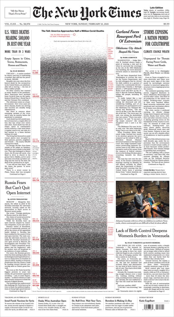Mỗi một chấm nhỏ kia là 1 người Mỹ qua đời vì Covid. 500.000 cái chấm xuất hiện trên trang đầu New York Times như hình ảnh tín hiệu nhiễu thường hiện trên TV, làm người ta rơi vào các lớp cảm xúc lẫn lộn. Mình nghĩ, có lẽ, nếu nó phát ra âm thanh thì là tiếng gió quyện trong một không gian sâu giống trong đoạn ghi âm mà Perseverance, tàu thăm dò bề mặt sao Hỏa, vừa gởi về. Sau rốt, tất cả lại câm lặng, nén một hơi thở lỗi một nhịp tim rồi tiếng lần giở trang báo trở lại với ồn ào thường nhật. Cuộc sống vẫn tiếp diễn theo cách của nó. Nhưng làm ơn đừng quên, chúng ta là những con người…