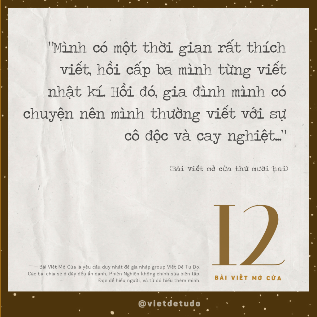 🔸 Bài Viết Mở Cửa là yêu cầu duy nhất để gia nhập group thực hành Viết Để Tự Do cùng Phiên Nghiên. Các bài chia sẻ trong album này đều ẩn danh, nguyên bản, KHÔNG chỉnh sửa, KHÔNG biên tập.