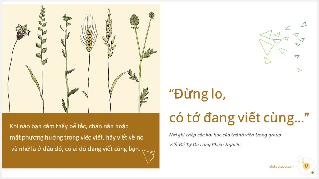 Viết Để Tự Do được Phiên Nghiên khởi xướng để kết nối cộng đồng những người thích Viết, thực hành Freewriting như một công cụ bày tỏ, tìm hiểu bản thân, vì khi một người hạnh phúc sẽ có một cộng đồng quanh họ hạnh phúc! Phiên và nhóm thực hiện luôn biết ơn sự chia sẻ của bạn, dù khoản đóng góp bằng “1 ổ bánh mì” hay “1 lò bánh mì”. Biết ơn vài phút mà bạn dành ra để thực hiện nghĩa cử này bằng cách click vào link dưới nha.