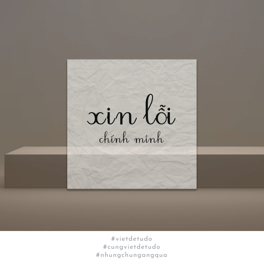 “Cám ơn hai chữ Xin lỗi. Tôi đã lạm dụng từ này nhiều vì sợ sai, sợ làm phiền người khác, vì tham muốn tỏ ra tử tế, vì muốn lấy sự thương hại. À bạn lịch sự lắm, à bạn đang ở thế yếu đáng thương lắm. Cần quan tâm… Cười khẩy với chính mình. Dùng lòng thương hại, nghĩa là đang khổ nhục kế, đạp chính mình để chiếm lấy tình thương của kẻ khác, với ý nghĩ là mình dẫn dắt thu phục họ, mình có một vị trí hay được kết nối với họ, mình có quyền lực hay có sức hút… Ngạo mạn ghê. Đạp mình xuống thì lấy gì mà trân yêu chính mình. Ờ, hôm nay cũng lôi được cái thâm cung cùng cốc trong tâm hồn mình ra rồi, chôn lâu vậy… Thả ra đi, nâng mình lên, với suy nghĩ và lời nói tích cực và thả đi những cái của lần sống trước đã mang theo, hay những trải nghiệm tuổi thơ đến giờ cũng đủ chất liệu rồi,… buông ra thả xuống mới rảnh rang nhìn ngắm từng ánh nắng ngọn cây, được hít hà hơi thở của gió, không khí, hương của cây, mùi đất ẩm, để về với cái nhạy bén của mùi hương, của sắc, âm thanh tự có của linh hồn mình. Món quà của mình, cái nhạy với trực giác. Cám ơn cái chủ đề này, ôm hôn bạn. Xin lỗi bản thân đã để mình đau à, cố à, lòng vòng à,… Ừ xin lỗi, xin lỗi, xin lỗi, cứ nói đã, xin lỗi, xin lỗi, xin lỗi, vì tất cả những gì tôi đã biết, đã mang, chưa biết….”