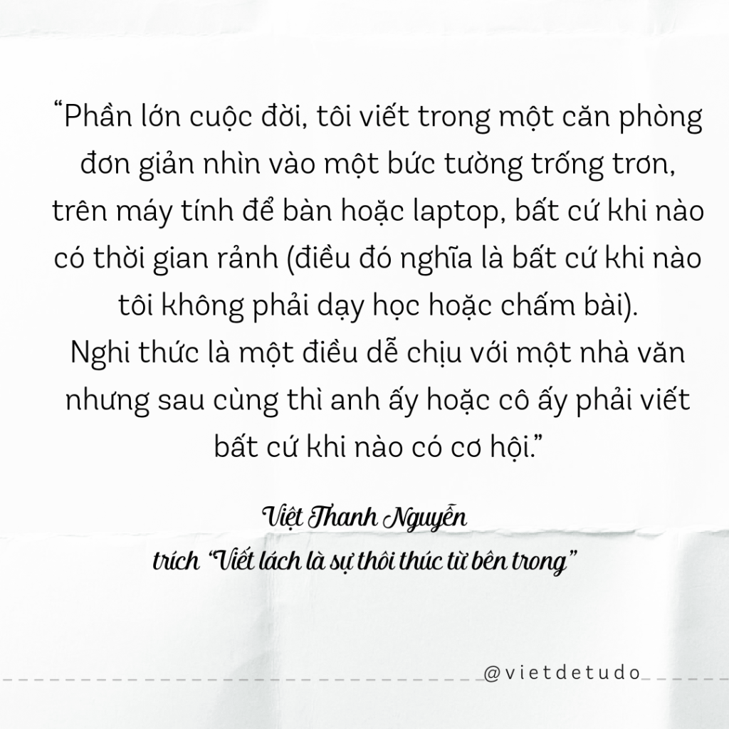 Phần lớn cuộc đời, tôi viết trong một căn phòng đơn giản nhìn vào một bức tường trống trơn, trên một máy tính để bàn hoặc laptop, bất cứ khi nào tôi có thời gian rảnh (điều đó nghĩa là bất cứ khi nào tôi không phải dạy học hoặc chấm bài). Nghi thức là một điều dễ chịu với một nhà văn nhưng sau cùng thì một nhà văn phải viết bất cứ khi nào anh ta hoặc cô ta có cơ hội. Khi tôi viết The Sympathizer là một dịp hiếm hoi tôi có xa xỉ thời gian. Tôi có hai năm nghỉ dạy vì vậy tôi có một lịch viết lách lý tưởng: tôi viết 4 tiếng vào buổi sáng, ăn trưa, chạy bộ (điều này giúp tôi giải tỏa đầu óc và nghĩ về việc viết lách của ngày hôm sau), sau đó tôi xem những chương trình TV hay vào buổi tối, điều này thường truyền cảm hứng cho tôi những ý tưởng để xây dựng cốt truyện.