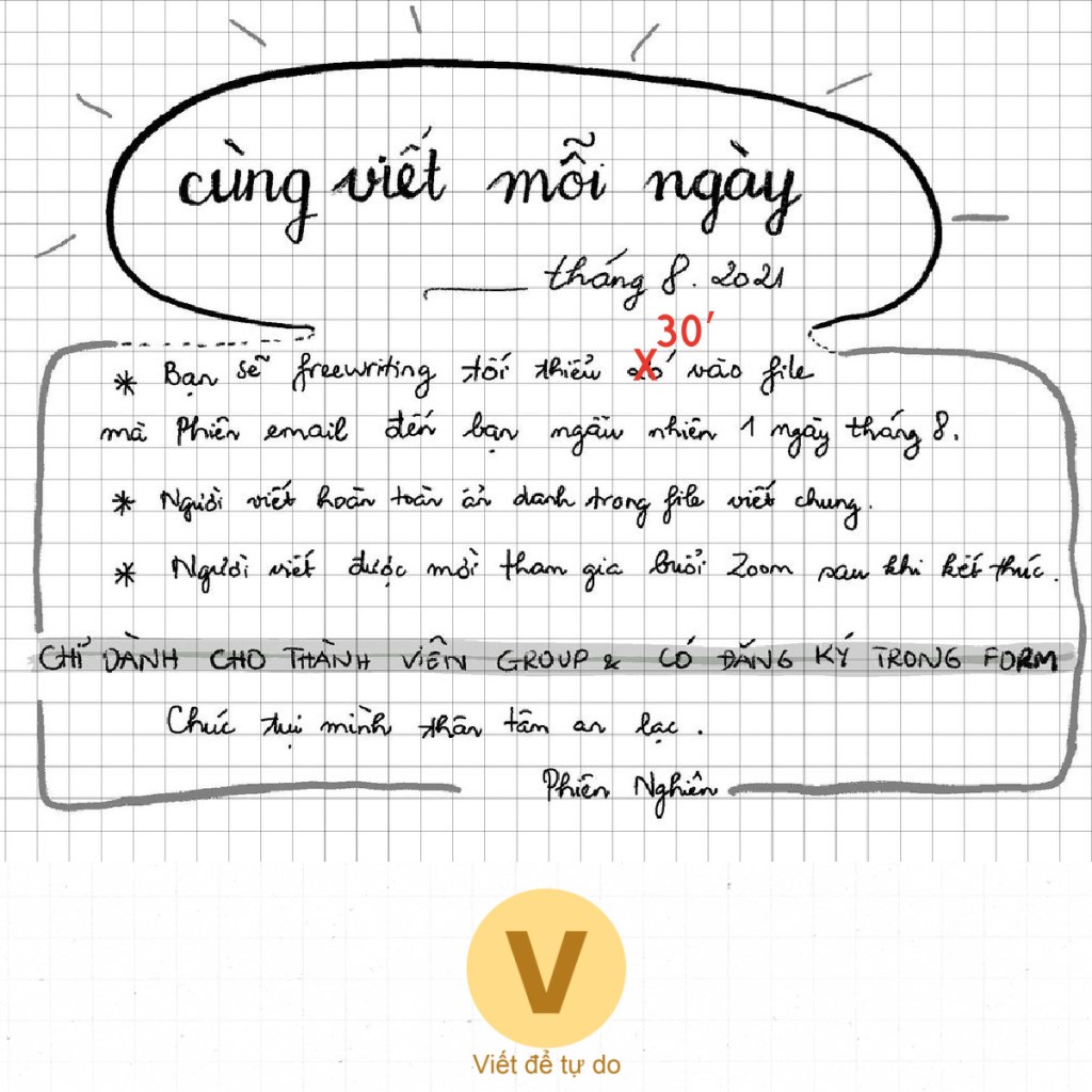 Hôm trước Phiên có chia sẻ muốn làm chi đó trong sức của mình, dành cho Group, trong thời điểm nhạy cảm và stressful này. Nhớ lại lúc Mỹ bắt đầu lockdown hơn 2 năm trước cũng là thời điểm mình dành nhiều thời gian hơn cho việc viết mỗi ngày rồi duy trì đến tận bây giờ. Vì vậy, Phiên tạo project nhỏ CÙNG VIẾT MỖI NGÀY (8.2021) mong rằng sẽ giúp bạn tiếp cận với freewriting, giải tỏa bớt những nghĩ suy, cảm xúc, hoặc đơn giản là ghi nhận lại chính bạn trong thời điểm hiện tại và chia sẻ với người khác.