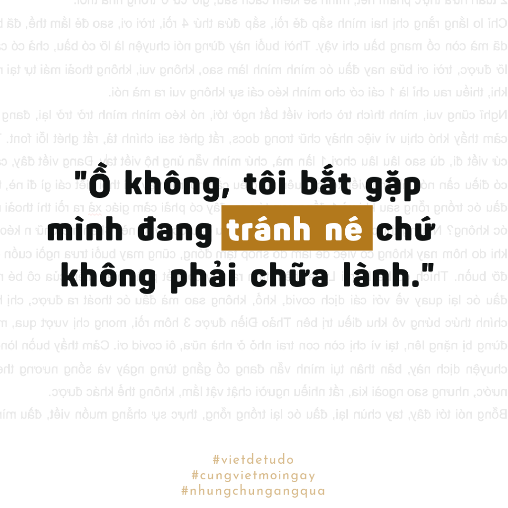 • Trích đoạn từ Freewriting của 1/50 bạn “CÙNG VIẾT MỖI NGÀY” tháng 8.2021. Phiên giữ nguyên flow bài viết của người thực tập, chỉ chỉnh typo để độc giả dễ theo dõi. Bạn có thể thấy những lỗi nho nhỏ như chính tả, ngữ pháp… nhưng chúng được phép xảy ra khi thực hành Freewriting. Be free!