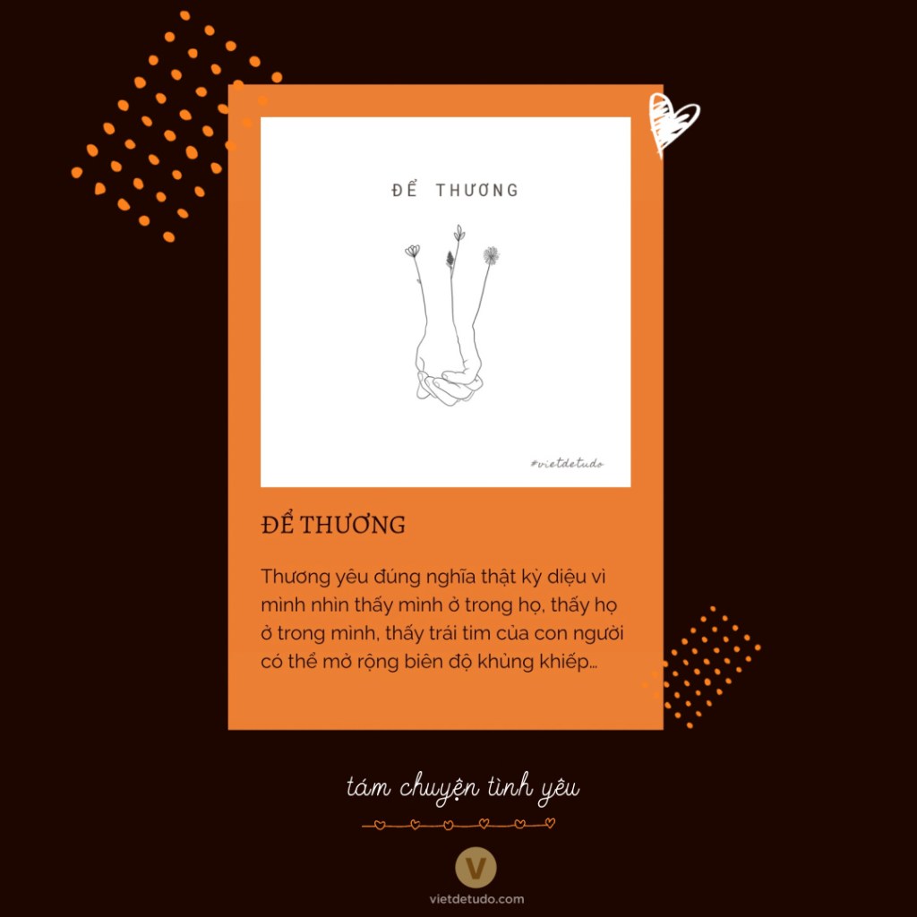 “Vì chúng ta chỉ có thể thấy mình rõ nhất qua nhau, nên người ta bảo tình yêu là mối quan hệ đặc biệt giúp mình dễ thấy, làm hiển lộ thứ có sẵn. Xấu sẵn và đẹp sẵn. Có đủ cho hết thảy chúng ta, bên trong chúng ta. Nếu ở với ai mà bạn thấy hiển lộ nhiều đau khổ, đừng cho là vì họ nên bạn khổ hết, mà đó vốn của cải nơi mình, hãy đem về mài giũa. Nếu ở gần ai mà nhiều hạnh phúc, đừng cho là nhờ họ cả, mà đó cũng vốn của cải nơi mình, hãy “đầu tư” thêm sự dễ thương.”