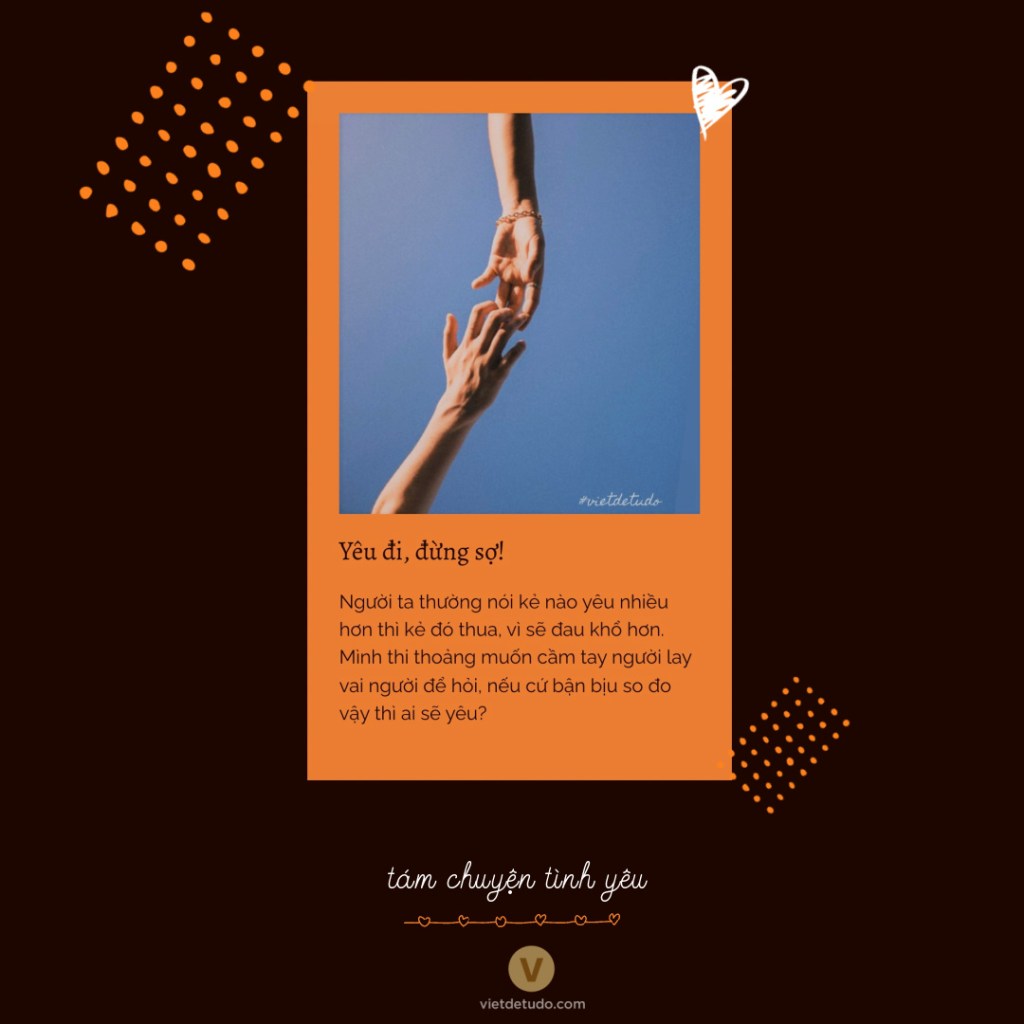 “Sợ những cảm giác mới mẻ sóng trào. Sợ rồi sẽ đau nhiều hơn hạnh phúc. Sợ mình không lo đủ cho người ta. Sợ mình không xứng đáng. Sợ mình thương nhiều quá. Sợ người ta không thương mình… Mấy nỗi sợ làm mình bước qua quãng mở của trái tim bằng đau khổ nhiều hơn tận hưởng, để sau này nhìn lại thường nhiều tiếc nuối. Trái tim biết rung động là trái tim còn đang được sống. Vậy tại sao lại sợ? Tại sao lại dỗ nó ngủ yên đi rồi lại đau đáu khao khát yêu thương? Tại sao mình lại từ chối cảm nhận tình thương này?”