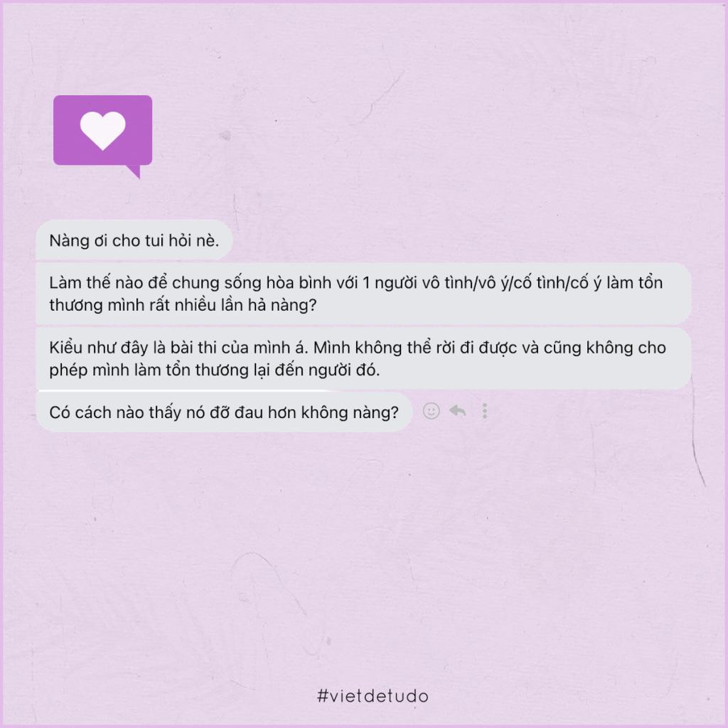 Nhưng nếu mà đau quá không thể tha thứ nổi, hãy tạm nghỉ vì nỗi đau cần được nhìn thấy và san sẻ. Hãy quay lại những nguồn lực, và tìm cách mềm mại thương mình. Như cách bạn đã nhắn cho mình một cái tin, và mình thực sự chia sẻ niềm đau với bạn trong khoảnh khắc tột cùng đó.