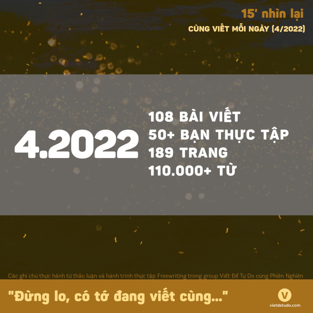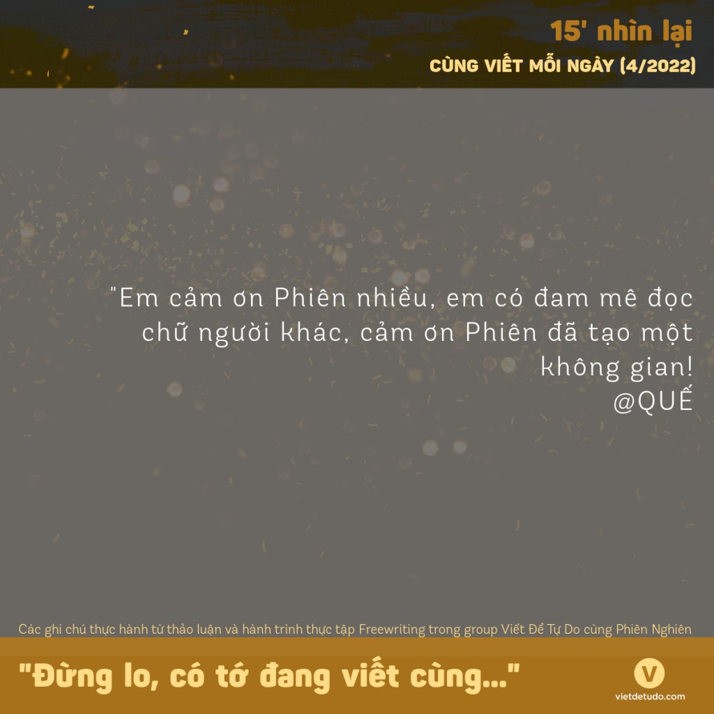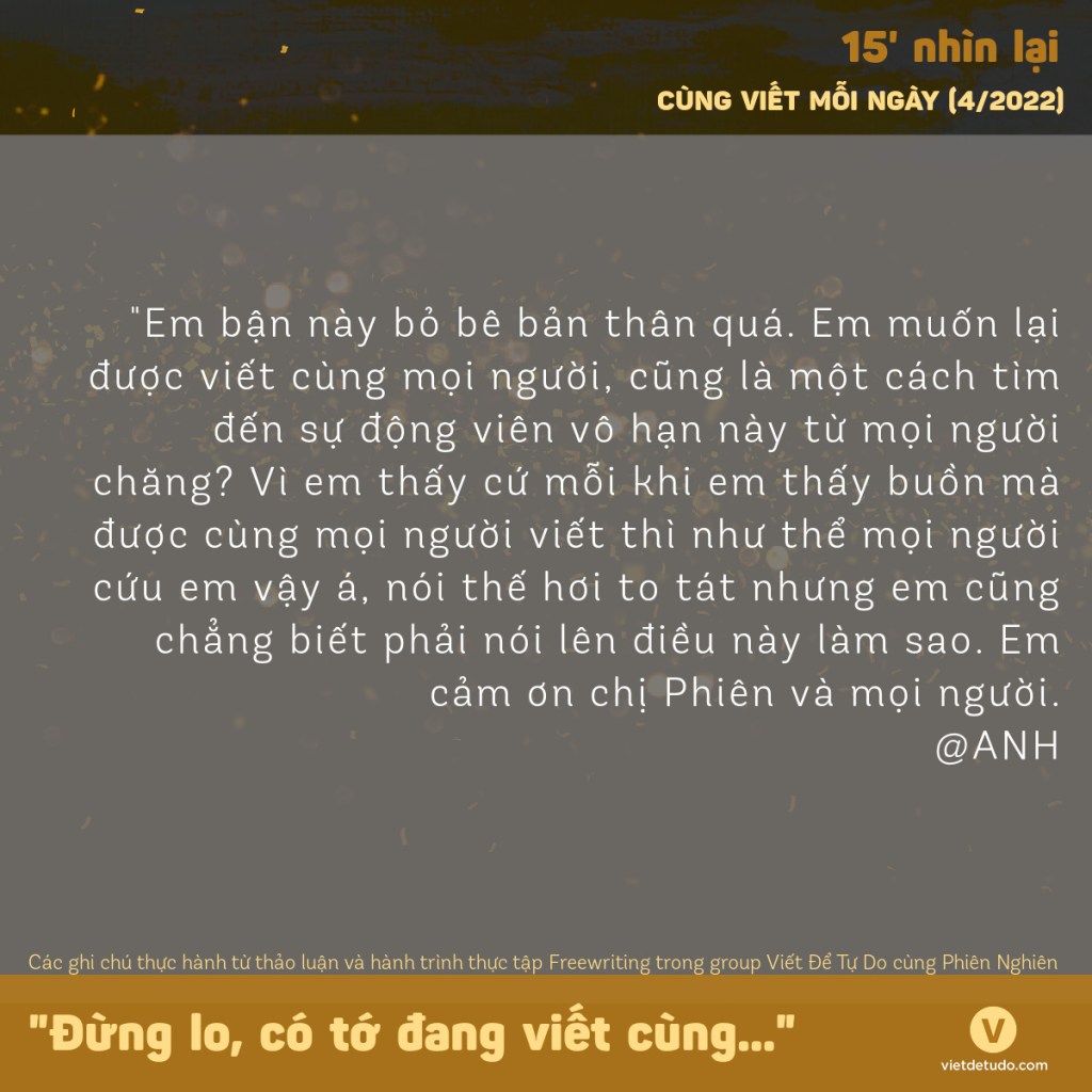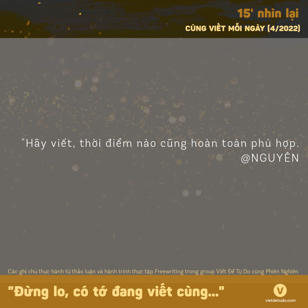 Cùng Viết Mỗi Ngày lần thứ sáu (4/2022) là cuộc viết chung của hơn 50 bạn thực tập freewriting trong group thực hành Viết Để Tự Do cùng Phiên Nghiên.