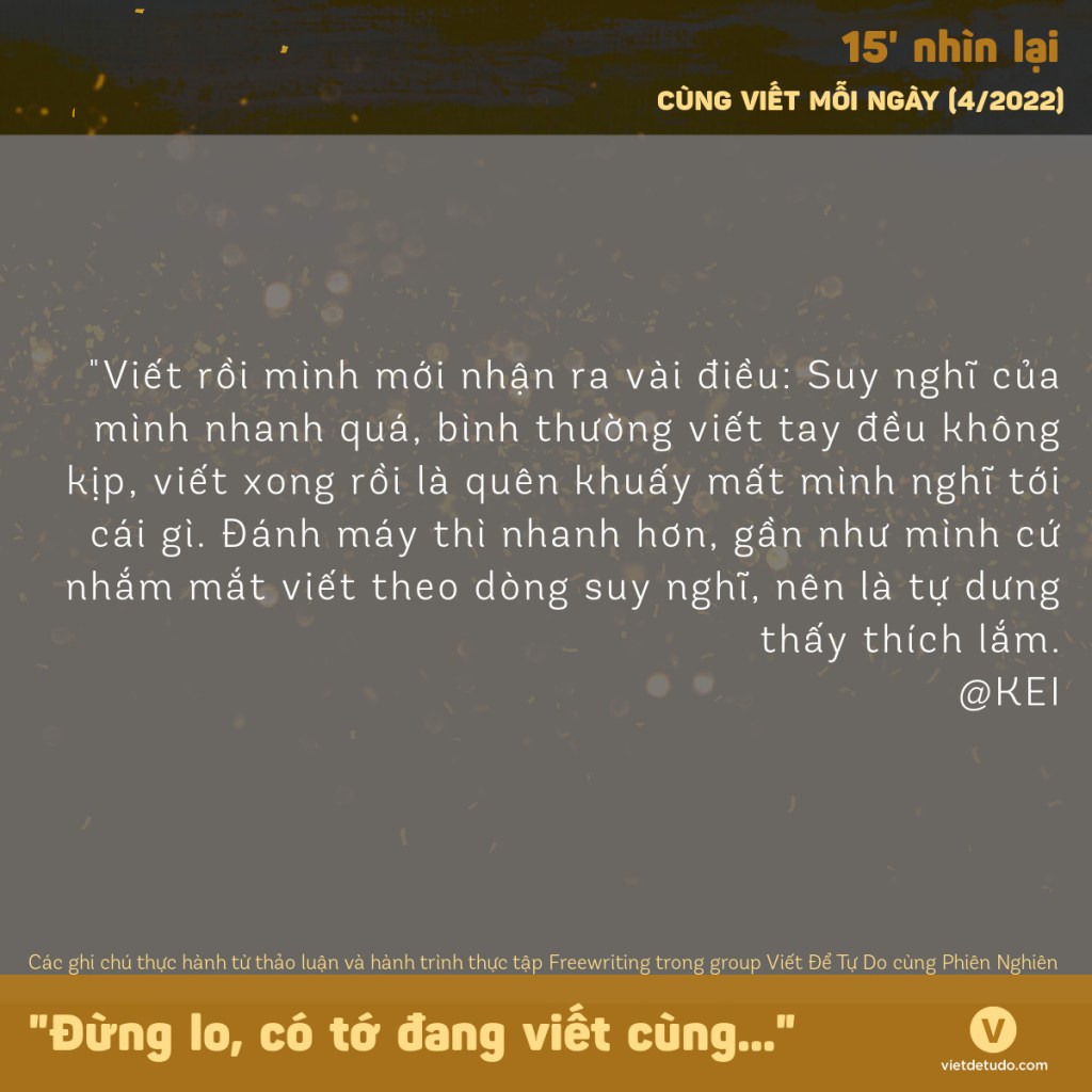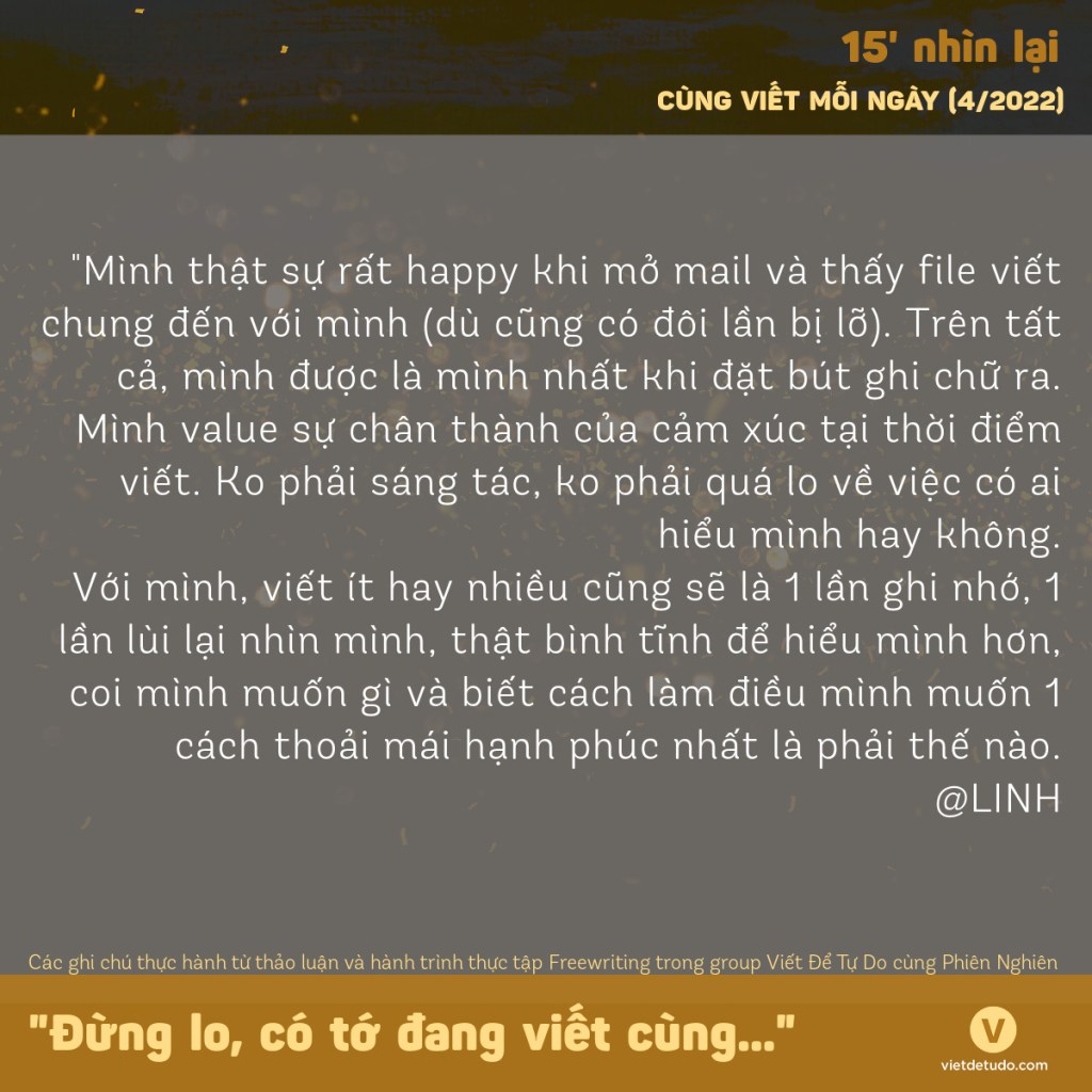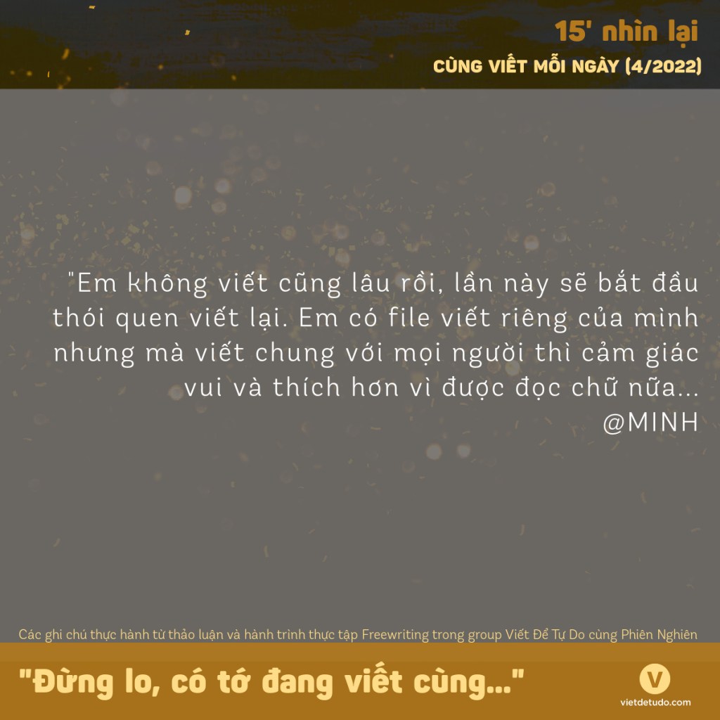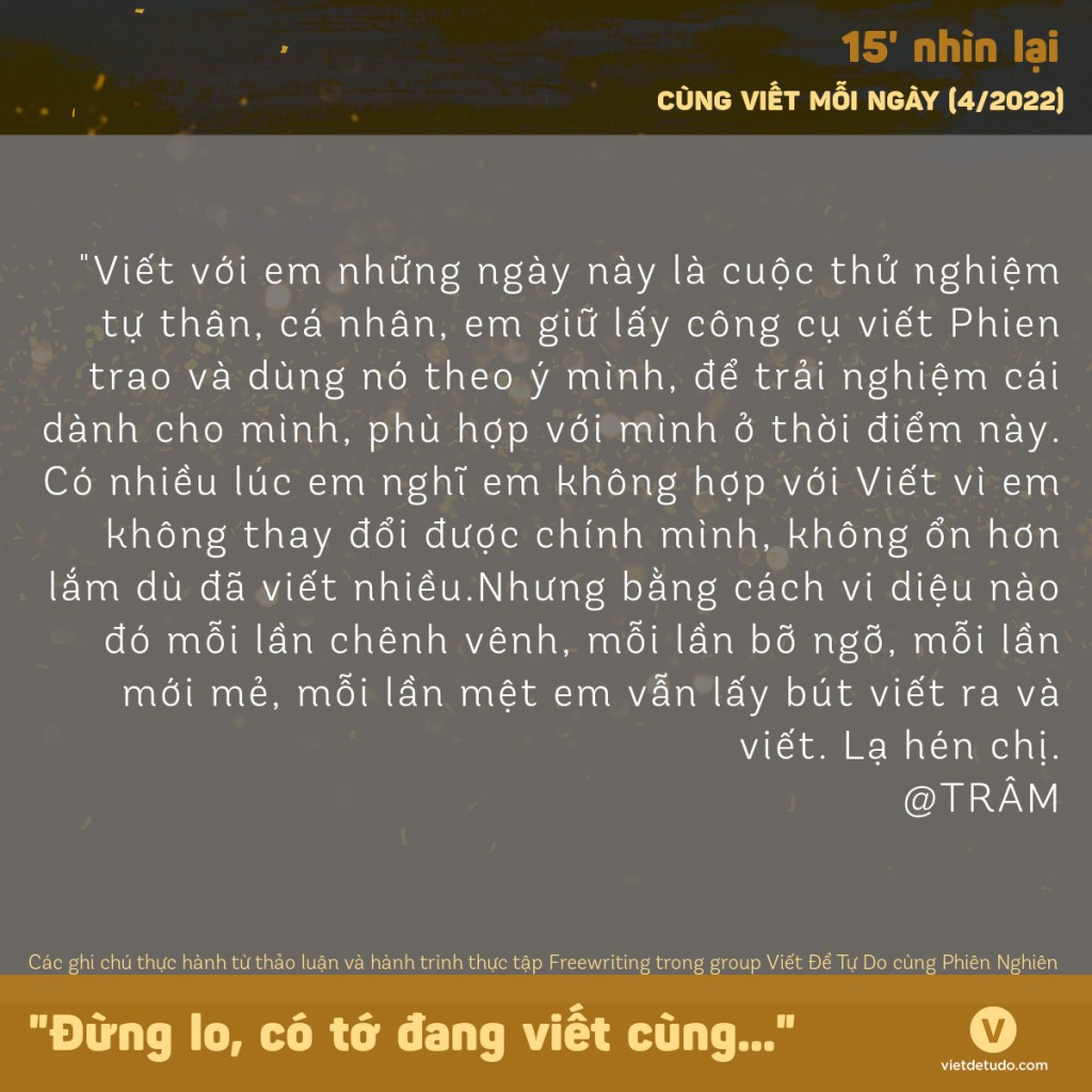 Cùng Viết Mỗi Ngày lần thứ sáu (4/2022) là cuộc viết chung của hơn 50 bạn thực tập freewriting trong group thực hành Viết Để Tự Do cùng Phiên Nghiên.