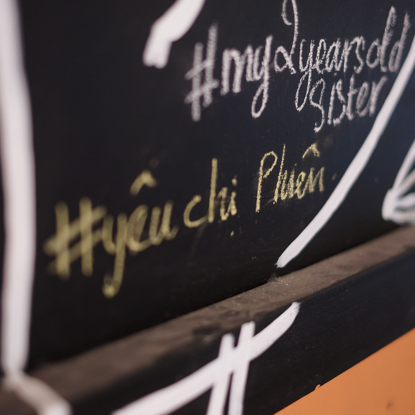 Ai tới Toa Tàu hồi lâu chắc còn nhớ cái bảng đen (thực chất là mặt sơn đen sau cánh cửa lớn), tụi mình ghi đủ thứ linh tinh trên trời dưới biển, nhưng người ta bước vô đọc thấy liền một thế giới bởi nó thiệt, nó thương. Có đứa ghi #yêuchịPhiên, mình đi ngang cười hoài