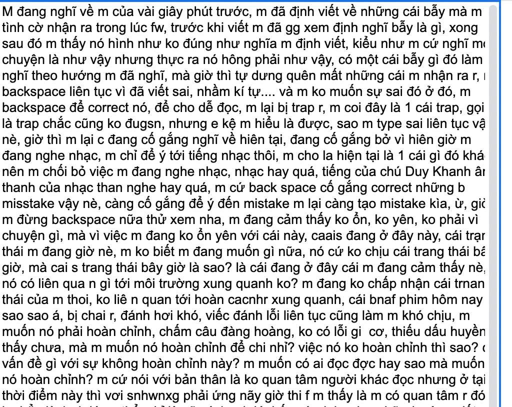 Có những bạn chưa quen thực tập Freewriting kiểu Cùng Viết Mỗi Ngày nên chọn cách viết như viết status ngắn trên FB, thậm chí copy lại 1 bài blog để lên File Viết Chung. Phải nhấn mạnh là Phiên rất trân trọng nỗ lực của bạn từ việc nghĩ đến thực tập, mở link File Viết Chung, rồi ngồi xuống với form đó. Đã đi được đến đây rồi thì mình hãy thử mạnh dạn mở rộng trải nghiệm của mình bằng cách thực tập như Phiên hướng dẫn (viết liên tục không ngừng trong 30′ và bắt đầu bằng “Mình đang nghĩ về…”), thay vì copy một bài blog khác vào File.