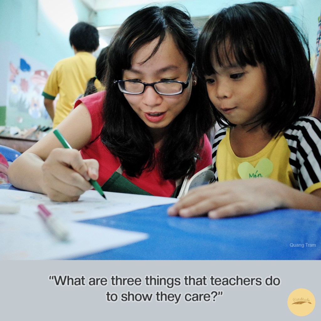 Năm 2020, một nghiên cứu (3) trong 200 học sinh tại các trường trung học cơ sở công lập Canada tìm hiểu về ba điều mà học sinh nghĩ là giáo viên quan tâm đến học trò hay làm (“What are three things that teachers do to show they care?”), mình tạm gọi là 3 điều thầy cô tận tâm trao tặng. Kết quả hướng về một Lớp học tỉnh thức.