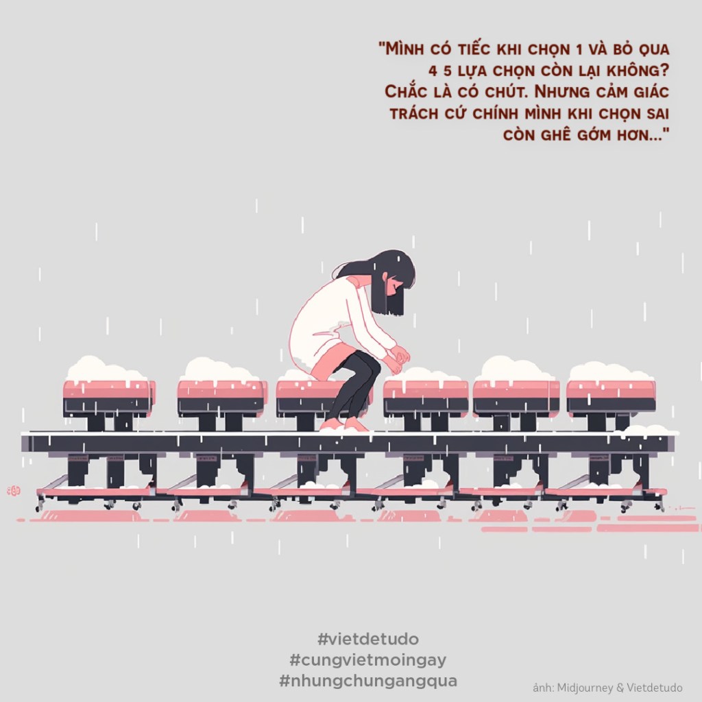 Mình có tiếc khi chọn 1 và bỏ qua 4 5 lựa chọn còn lại không? Chắc là có chút. Nhưng cảm giác trách cứ chính mình khi chọn sai còn ghê gớm hơn. Sự dằn vặt nó cứ mon men đi vào trong tâm trí mình, gõ đầu mình rằng mình sai rồi. Đôi khi người ta bảo sai cũng không sao. Nhưng không. Mình sai, sai là một cảm giác siêu tệ hại với mình. Cứ mắc một lỗi dù nhỏ nhất thì lòng tự trọng trong mình lại bị bào mòn đi htêm 1 chút. Chẳng có gì là dễ chịu cả. Tư duy đó, mình biết là sự thụt lùi so với những tư duy phát triển nhưng mình không biết cách nào ở hiện tại đề fix cái lỗ đó đi…