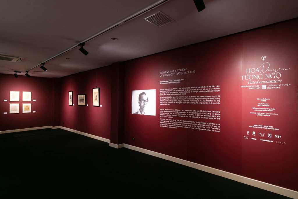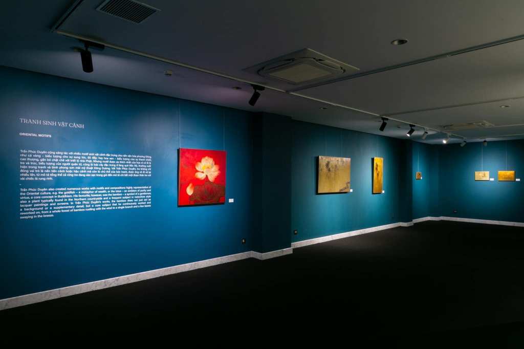 Không gian bắt đầu bằng những giới thiệu vừa phải về tiểu sử Trần Phúc Duyên. Tranh được xếp theo dòng thời gian, từ những bức vẽ đầu tiên, thời ông đi học Trường Mỹ Thuật Đông Dương năm 1942, rồi theo loại hình tranh, tranh lụa, tranh khắc gỗ, tranh sơn mài… Chủ đề được vẽ nhiều nhất là phong cảnh. Đã nhiều bài viết về tài năng của ông, điều được thể hiện rõ ở những bức sơn mài to bằng bức tường mà dịu dàng, uyển chuyển, mà tình cảm và chi tiết vô cùng.