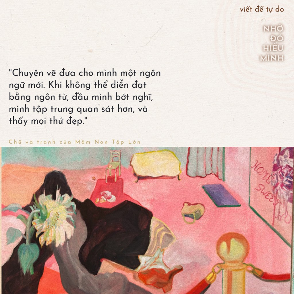 Chuyện vẽ đưa cho mình một ngôn ngữ mới. Khi không thể diễn đạt bằng ngôn từ, đầu mình bớt nghĩ, mình tập trung quan sát hơn, và thấy mọi thứ đẹp. Mình được nhìn mọi thứ với góc nhìn khác, được thấy tâm tư của mình, được chơi.
