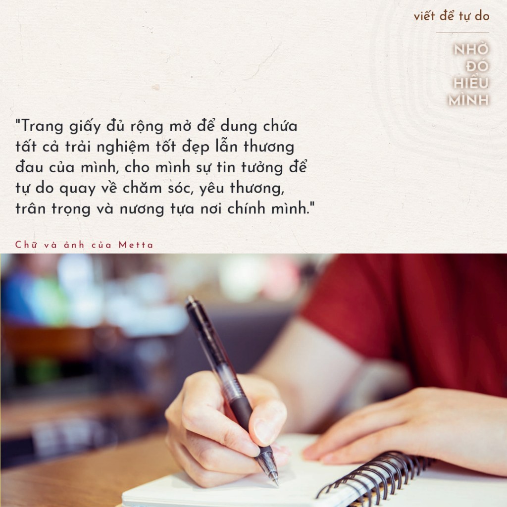Với những cái thấy như vậy, mình đã hứa với chính mình sẽ thân thiết với người bạn nhật ký, vì chỉ có bạn ấy mới có thể giúp mình hiểu mình từng ngày… mỗi ngày. Viết giúp mình thấy an toàn khi chia sẻ, thấy được thương, được hiểu và không lo bị phán xét. Trang giấy đủ rộng mở để dung chứa tất cả trải nghiệm tốt đẹp lẫn thương đau của mình, cho mình sự tin tưởng để tự do quay về chăm sóc, yêu thương, trân trọng và nương tựa nơi chính mình.