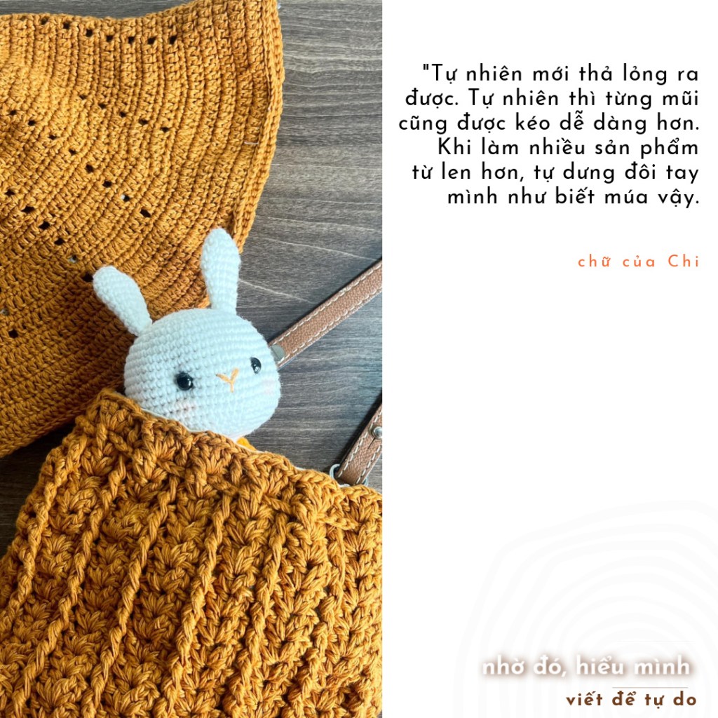 Mình nhớ những ngày đầu mới tập, với cái độ gồng như vậy, mình đã toát mồ hôi ở tay, ở cả trán. Mình đã không hiểu rằng tại sao người ta trông lại có vẻ thư thái đến vậy, tại sao người ta lại không bị đau tay? Có lúc thương đôi tay quá, mình bỏ cuộc. Nhưng những lúc khó đối diện với sự tĩnh lặng khi ở nhà một mình, mình lại nhớ đến móc. Mình cứ nghĩ đến hình ảnh đôi tay biết múa, ngay trước mặt mình thì lại muốn tiếp tục chứ cũng chẳng vì một động lực sâu xa nào cả.