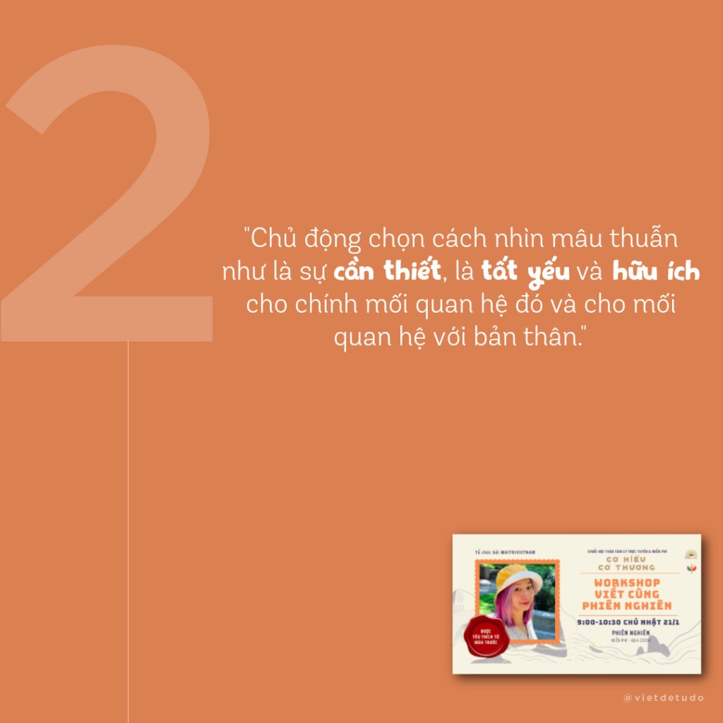 Việc biết rằng mâu thuẫn trong mối quan hệ là bình thường, là cần thiết, là hữu ích cho chính mối quan hệ đó và cho mối quan hệ với bản thân, là bước đầu để thay đổi tâm thế mỗi khi gặp mâu thuẫn, để có được “healthy conflict”.