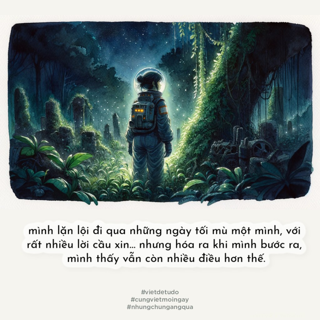 nội tâm của mình với nỗi sợ bị bỏ rơi từ đâu đó mình chẳng biết, những ngày mình nói với mình mình không biết phải làm gì hết. mình nghĩ mình cũng chẳng xứng đáng được yêu thương gì đó… mình lặn lội đi qua những ngày tối mù một mình, với rất nhiều lời cầu xin… nhưng hóa ra khi mình bước ra, mình thấy vẫn còn nhiều điều hơn thế.
