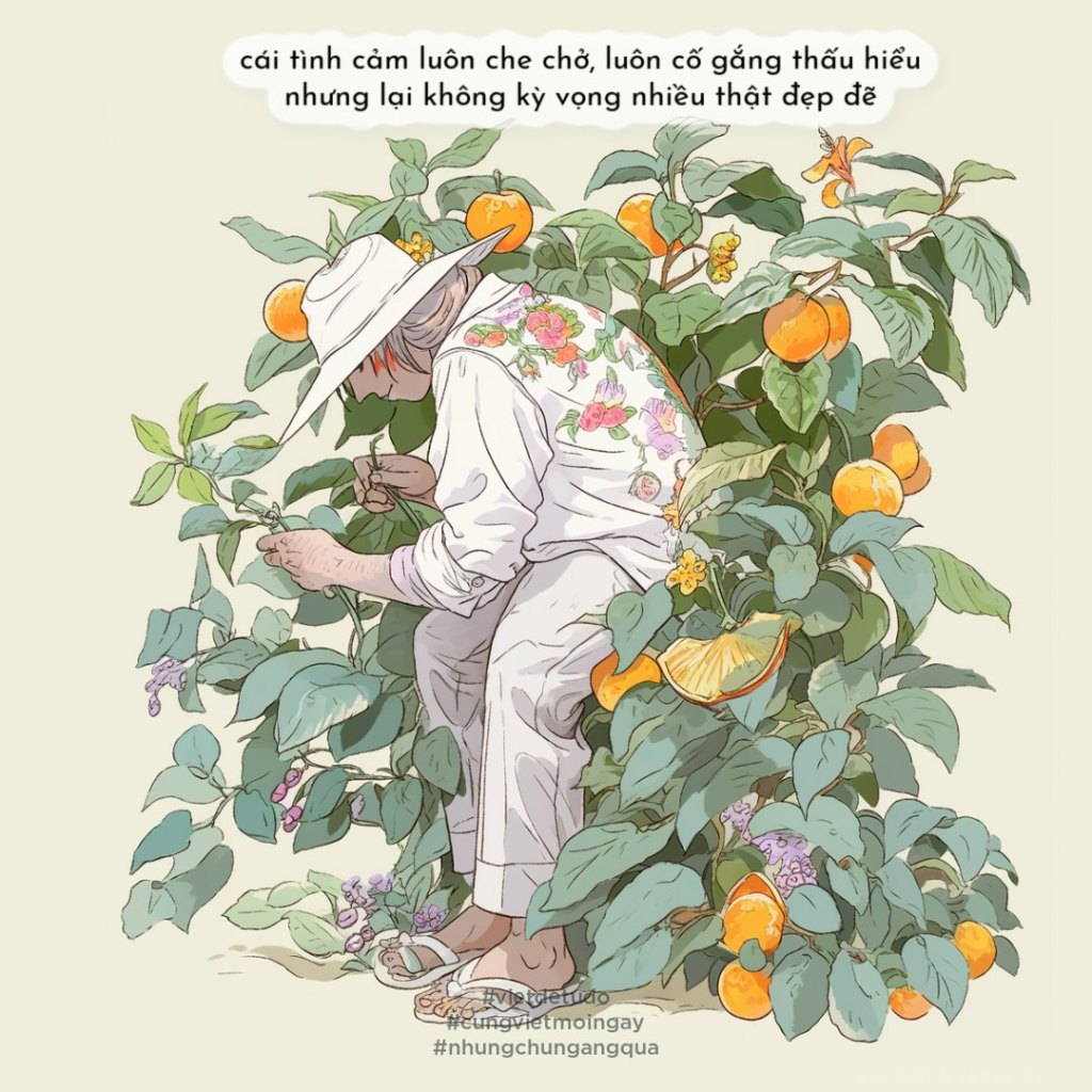 Mình nghĩ cái tình cảm luôn che chở, luôn cố gắng thấu hiểu nhưng lại không kỳ vọng nhiều thật đẹp đẽ. Nó là một cái mạng lưới an toàn, mà ở bên trong mình có thể sống tự do. Mình biết mình có thể nói hết những gì mình nghĩ. Nhưng mình cũng biết dừng lại khi nói như vậy là đủ. Mình vừa an toàn vừa tạo ra sự an toàn cho mọi người. Nó là một điều thật hiếm có. Hoặc ít nhất là hiếm có đối với mình. Nó có một cái mức cân bằng tinh tế giữa tôi luôn biết tôi có thể dựa vào, có người lắng nghe tôi, có người hiểu những câu chuyện đùa kỳ cục của tôi và nếu ngay lúc này bạn không làm tất cả những điều đó, thì vẫn ổn.