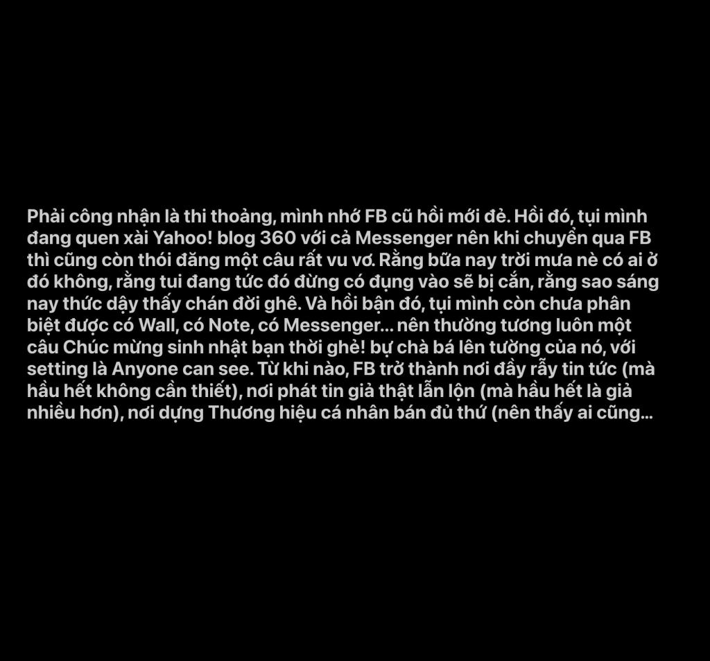 Phải công nhận là thi thoảng, mình nhớ FB cũ hồi mới đẻ. Hồi đó, tụi mình đang quen xài Yahoo! blog 360 với cả Messenger nên khi chuyển qua FB thì cũng còn thói đăng một câu rất vu vơ. Rằng bữa nay trời mưa nè có ai ở đó không, rằng tui đang tức đó đừng có đụng vào sẽ bị cắn, rằng sao sáng nay thức dậy thấy chán đời ghê. Và hồi bận đó, tụi mình còn chưa phân biệt được có Wall, có Note, có Messenger… nên thường tương luôn một câu Chúc mừng sinh nhật bạn thời ghẻ! bự chà bá lên tường của nó, với setting là Anyone can see.