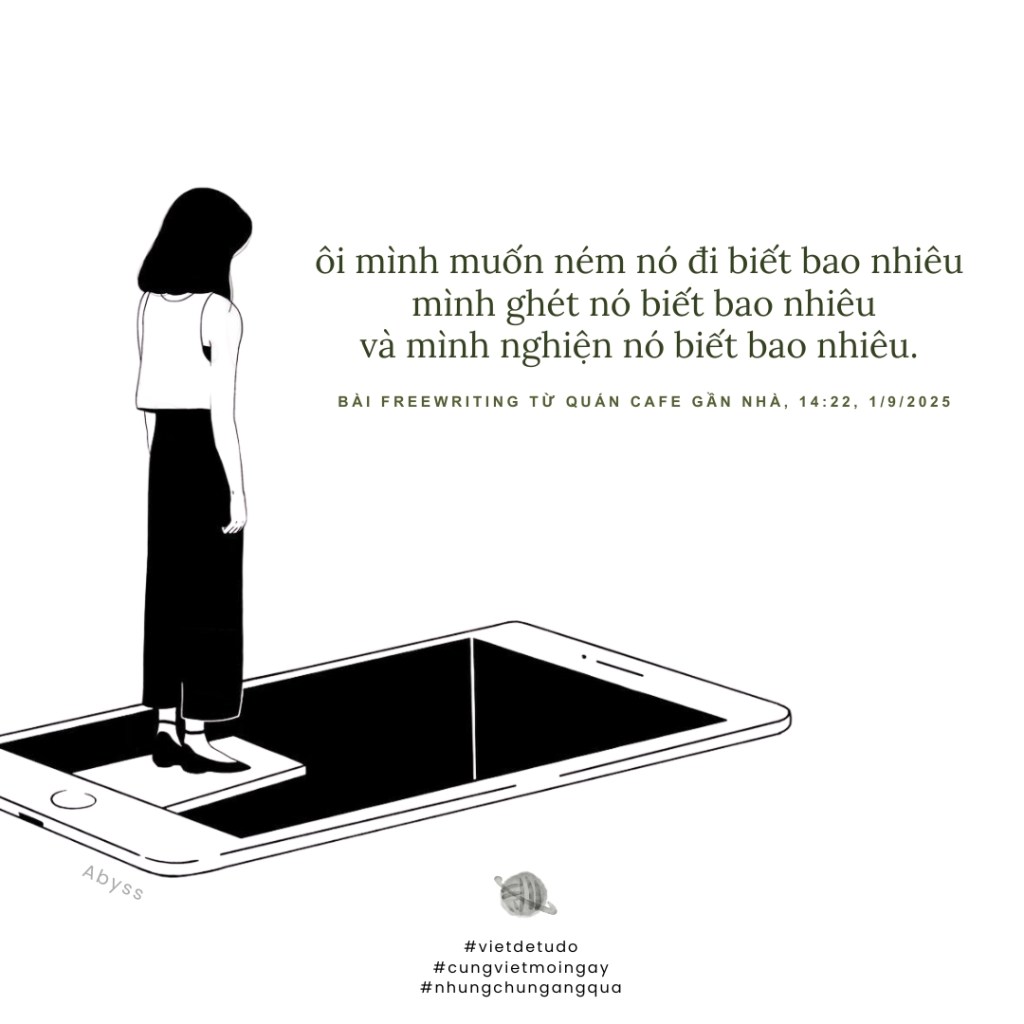 “lúc nãy đi đường mình thấy mình cô đôc, ko có bạn, ng bạn thân nhất, ko thể rời xa nhất là cái điện thoại. ôi mình muốn ném nó đi biết bao nhiêu, mình ghét nó biết bao nhiêu. và mình nghiện nó biết bao nhiêu.