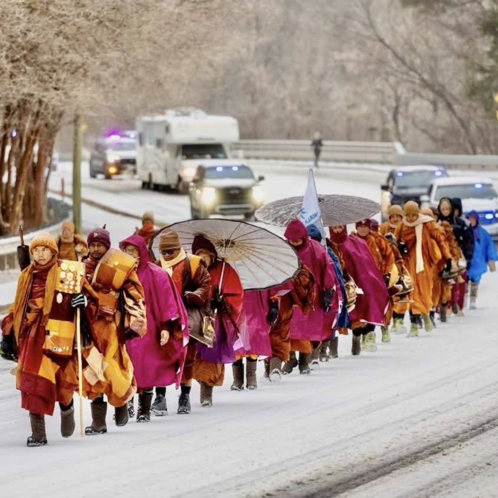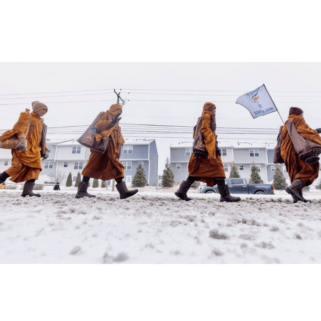 Ngày thứ 92 hành trình Walk For Peace, đoàn sư bộ hành vẫn đi dù tuyết rơi dày (khoảng -6 độ C). Bão tuyết đổ bộ khắp miền Trung nước Mỹ. Dù California chỉ lành lạnh, mình chui trong chăn còn thấy đau đầu. Thiệt sự ngưỡng mộ sức mạnh tâm – thân – trí của các sư và sự thương yêu của cộng đồng dành cho đoàn.