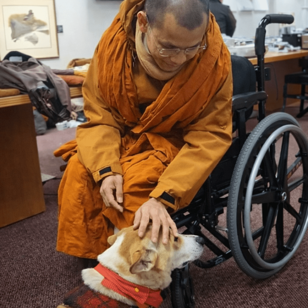 Và hôm nay, ngày 107 hành trình (9/2/2026) sư Maha Dam đã được bay đến điểm nghỉ đêm của đoàn tại Marymount University, đoàn tụ cùng các vị sư và Aloka.