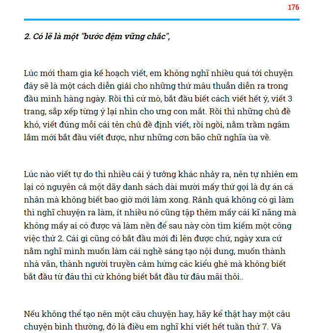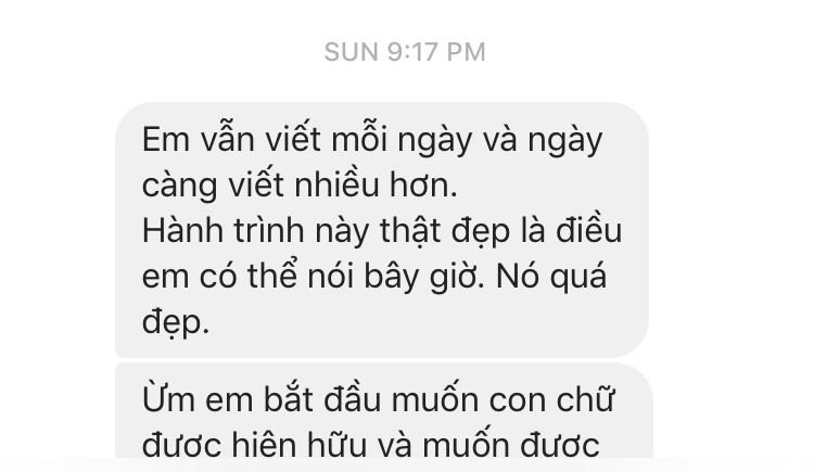 ” Khi mình can đảm viết, khi mình can đảm tỏ bày, khi mình viết cho mình, mình thấy không quan trọng dù ngoài kia thế nào, đây là điều quan trọng với mình. Và mình cần tiếp tục nó, để mình giữ sự quan trọng này tồn tại với mình”