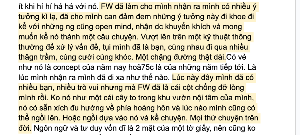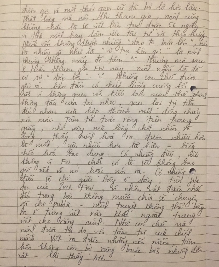” Mỗi lần viết FW là mỗi lần mình có cơ hội được tiếp xúc sâu với thế giới nội tâm của mình, đó là một cuộc đối thoại hay một cuộc trò chuyện sâu sắc với bản thân…”