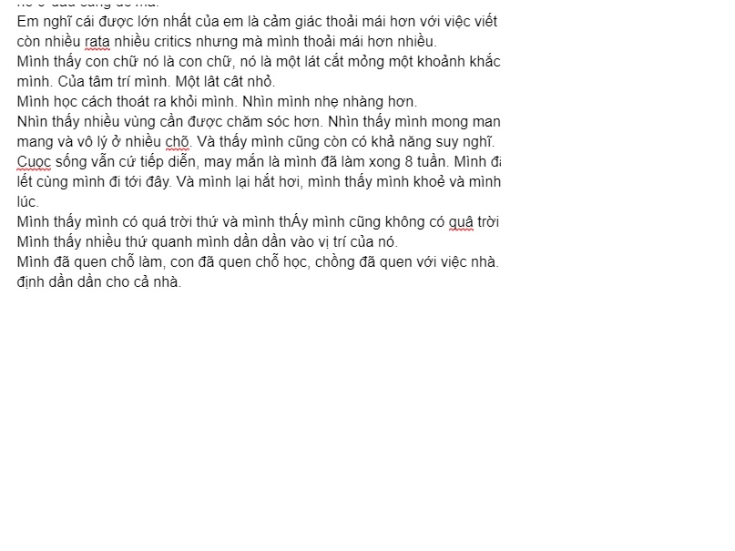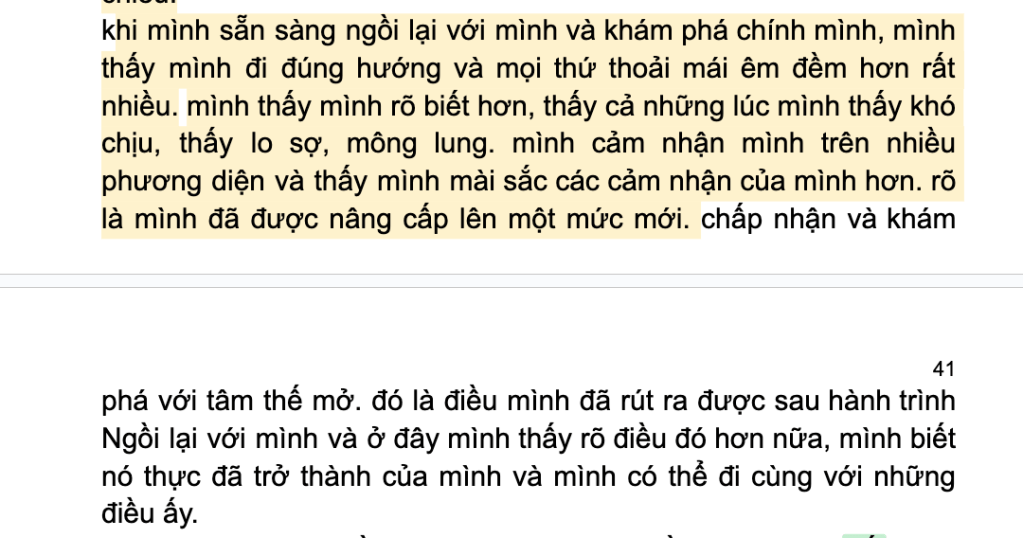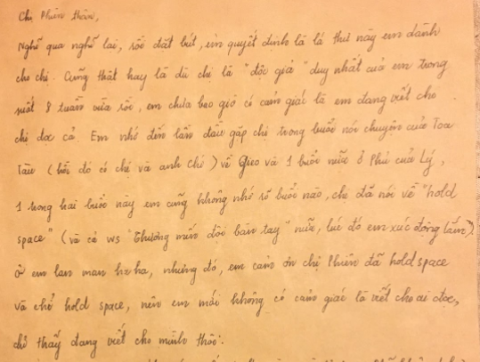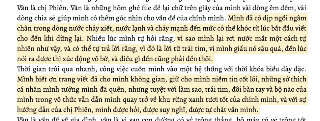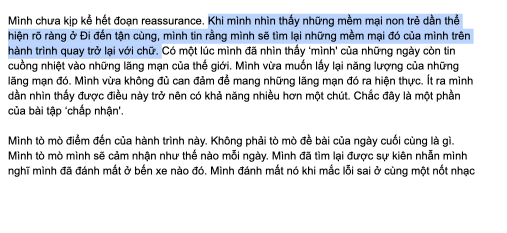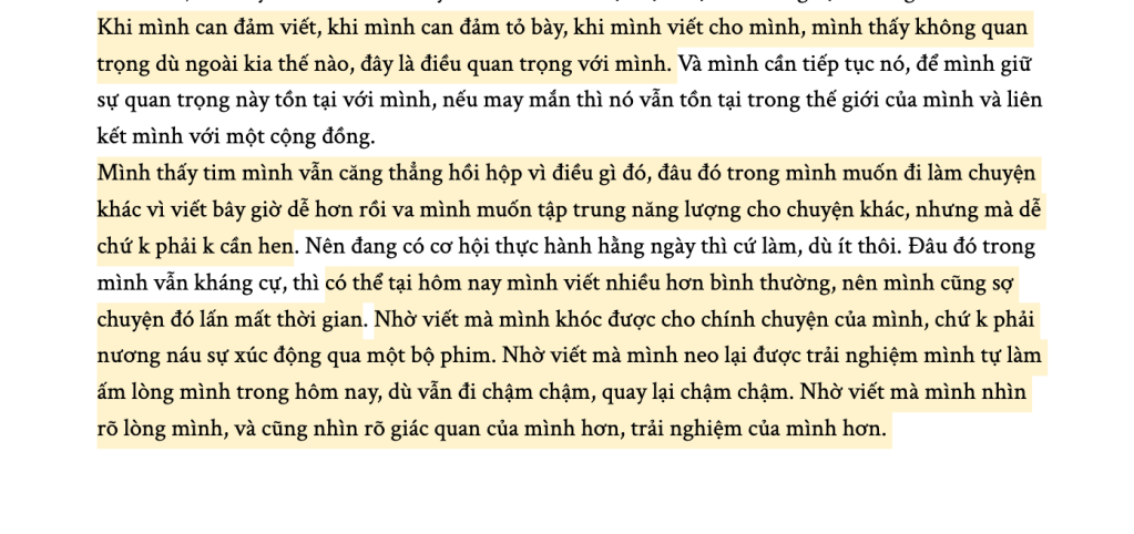 “Mình biết ơn mình đã thử nghiệm với freewriting nhé. Có lúc xà lơ, có lúc hơi xúc động chút. Lúc nào cũng là mình. Mình cảm thấy mình được ôm ấp vỗ về nhiều lắm.“