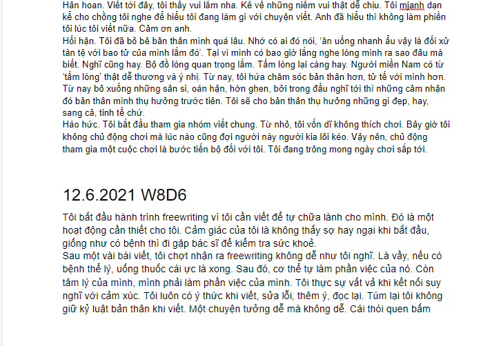“…Món quà lớn nhất từ 8 tuần này là việc luôn có thể viết bất cứ lúc nào, và buông bỏ được mục đích khi freewriting, viết chỉ để viết thôi.“