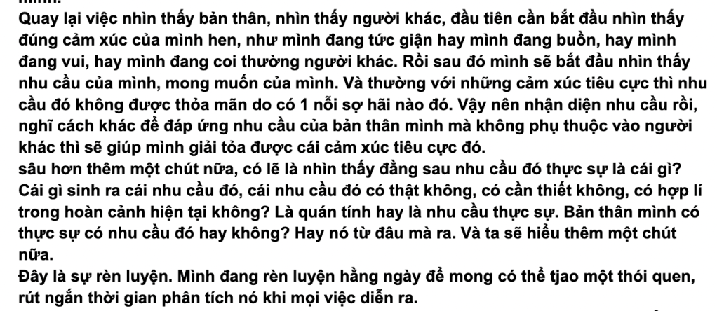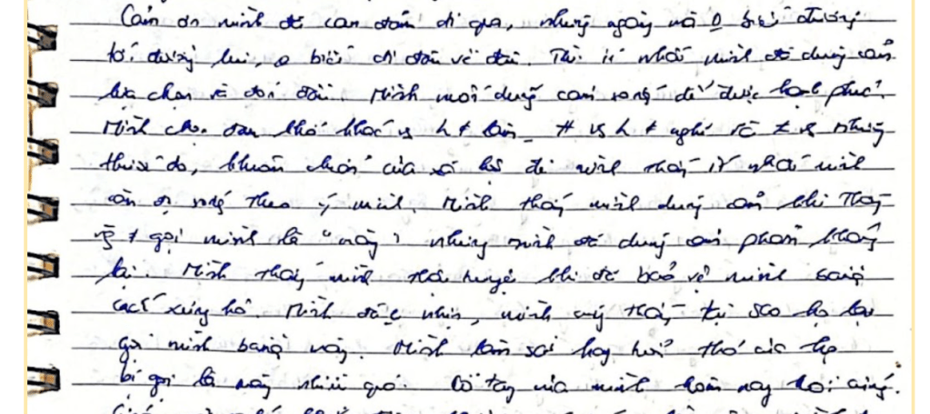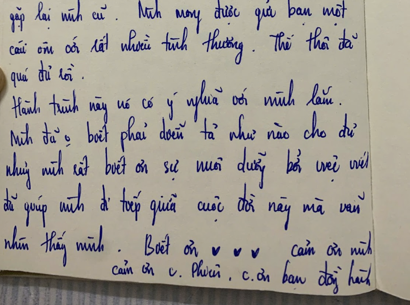 “Mình cứ viết xuống cái đã, có cái gì, hay là không có cái gì, thì cái đó mình có thể thấy sau… Mình cảm thấy háo hức và có hi vọng hơn với hành trình viết của mình đó, mình thấy có nhiều điều mở ra cho hành trình thực hành sắp tới với mục tiêu là thay đổi những mô thức hành vi cũ của mình.”