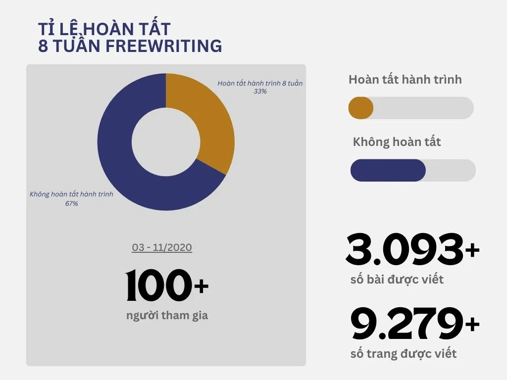 Từ tháng 3.2020 đến nay đã có hơn 100+ bạn tham gia 8 tuần Freewriting. Tỉ lệ hoàn tất đầy đủ 8 tuần viết là 33%. Nhiều người đã tạm ngưng giữa chừng vì nhiều lý do. Phiên trân quý cả người dám bắt đầu hành trình dù dang dở, cũng như người đã nỗ lực đi hết hành trình trọn vẹn.